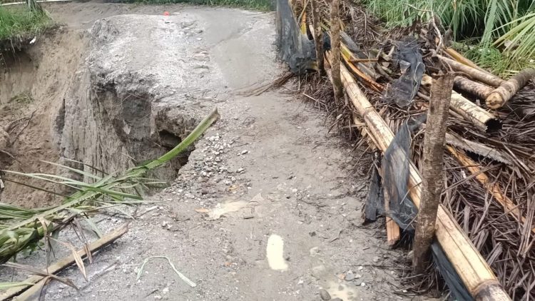 Pantauan jurnalis SimadaNews di lokasi, badan jalan yang tersisa kini hanya sekitar satu meter dan hanya bisa dilalui kendaraan roda dua.